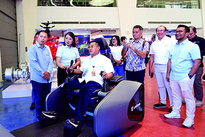 在全球研發(fā)中心展廳,代表團(tuán)一行深入了解柳工從創(chuàng)立至今在技術(shù)創(chuàng)新、市場(chǎng)拓展等方面的輝煌成就?,F(xiàn)場(chǎng)觀看完5G智能遙控電動(dòng)裝載機(jī)的鏟裝作業(yè)演示后,代表團(tuán)成員還體驗(yàn)了遙控駕駛,這一智能技術(shù)應(yīng)用成果讓代表團(tuán)大開(kāi)眼界。
