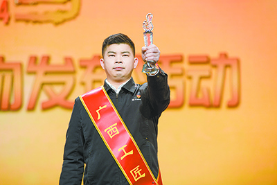 朱飛手持“廣西工匠”獎杯。