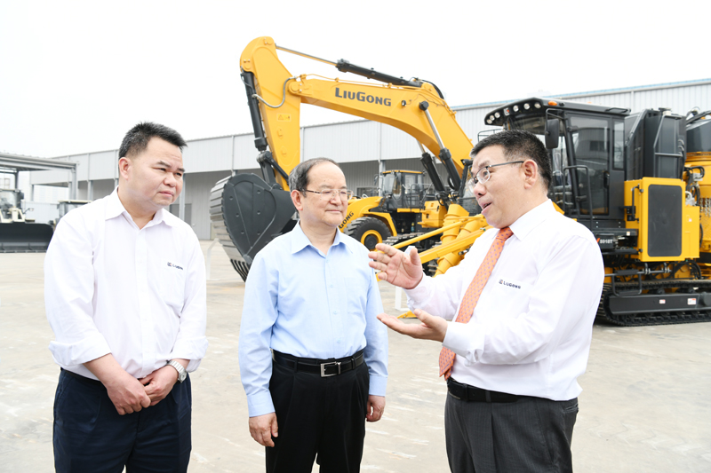 曾光安(右一)向鹿心社(中)介紹柳工機(jī)械