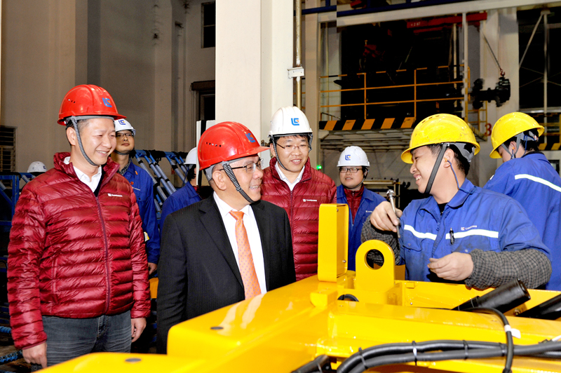 2017年12月29日晚九時(shí)三十分,當(dāng)月第1899臺(tái)裝載機(jī)在裝載機(jī)公司裝配工廠順利下地,裝配現(xiàn)場無不歡聲雷動(dòng)。這預(yù)示公司全面奪取了“1899戰(zhàn)役”的勝利。曾光安、黃海波等公司領(lǐng)導(dǎo)以及股司相關(guān)職能部門的負(fù)責(zé)人連夜前往裝配工廠祝賀,并親切看望和慰問在裝配線的全體“將士”(如下圖)。