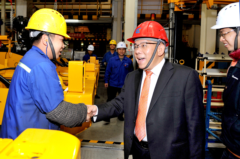 在剛下線的CLG8128H大型裝載機(jī)一側(cè),曾光安與列隊(duì)?wèi)c祝勝利的裝配線員工一一握手,他感謝大家為勝利奪取“1899戰(zhàn)役”付出的辛勤工作。曾光安在講話中高度贊揚(yáng)柳工人是英勇頑強(qiáng)、堅(jiān)不可摧的鋼鐵戰(zhàn)士。他說,“1899戰(zhàn)役”只是個(gè)熱身,2018年我們會(huì)迎來更大的挑戰(zhàn)。他對(duì)裝載機(jī)公司全體員工提出了五個(gè)方面的要求:一是打好新年開門紅的新戰(zhàn)役,為2018年挑戰(zhàn)更高產(chǎn)量目標(biāo)做好充分的準(zhǔn)備。二是努力提升工作效率和降生產(chǎn)運(yùn)營管理成本。他說,裝載機(jī)的盈利水平還有很大空間,成本控制是公司的重要工作之一。三是抓好產(chǎn)品質(zhì)量這根主線,2018年我們的產(chǎn)品質(zhì)量在現(xiàn)有基礎(chǔ)上要有更大的改善和提升。四是嚴(yán)把產(chǎn)品交貨期。要吸取2017年因進(jìn)口件及供方配套件不及時(shí)帶來的訂單流失的教訓(xùn),在保證產(chǎn)品質(zhì)量的同時(shí),嚴(yán)格按客戶指定的時(shí)間交貨,真正體現(xiàn)柳工是一家高質(zhì)量、高水平、高誠信的制造企業(yè)。五是努力打造一支懂管理、懂技術(shù)的年輕管理者人才隊(duì)伍,同時(shí)要重點(diǎn)培養(yǎng)生產(chǎn)一線員工中的大師級(jí)人才隊(duì)伍,讓年輕的新生力量成為有想法、有闖勁、勇?lián)?dāng)?shù)募夹g(shù)型工人隊(duì)伍。