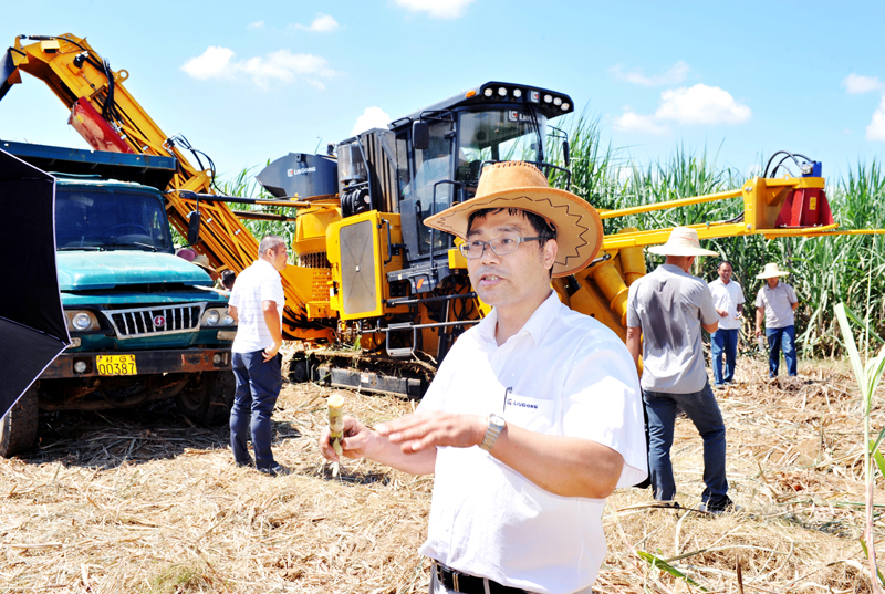 9月27日,距離甘蔗收獲期還有一個多月,來賓市廖平農(nóng)場的甘蔗田里卻忙開了,由來賓市農(nóng)業(yè)機(jī)械化管理局和柳工農(nóng)機(jī)公司共同舉辦的甘蔗生產(chǎn)全程機(jī)械化現(xiàn)場演示會正在熱鬧的進(jìn)行著。太陽被人聲鼎沸的場面吸引,過來湊熱鬧,展示會場面熱度、甘蔗田地表溫度節(jié)節(jié)攀升。集團(tuán)公司副總裁黃祥全(如下圖),自治區(qū)、柳州市、來賓市、行業(yè)等相關(guān)部門領(lǐng)導(dǎo),各大糖業(yè)集團(tuán)、農(nóng)業(yè)公司、合作社的代表,以及許多甘蔗種植大戶等近500名嘉賓到現(xiàn)場,在炙熱的陽光下,瞇縫著眼、呲著牙、伸長脖子,往甘蔗田里張望。