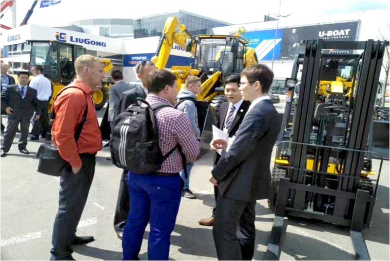柳工俄羅斯經(jīng)銷商在展會中,展出了公司全新H系列裝載機及俄語區(qū)銷售的主流工程機械產(chǎn)品。包括CLG835H和CLG856H型號的2臺裝載機,1臺CLG920E挖掘機,1臺CLG4215平地機,1臺CLG614H壓路機,2臺叉車以及1臺TD-15M銳斯塔推土機。